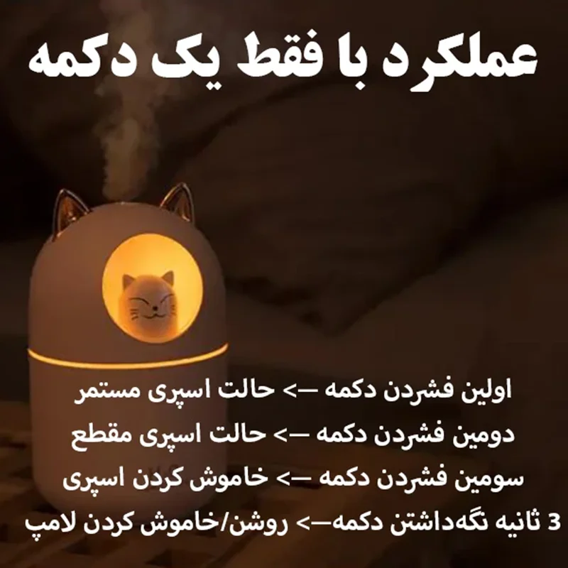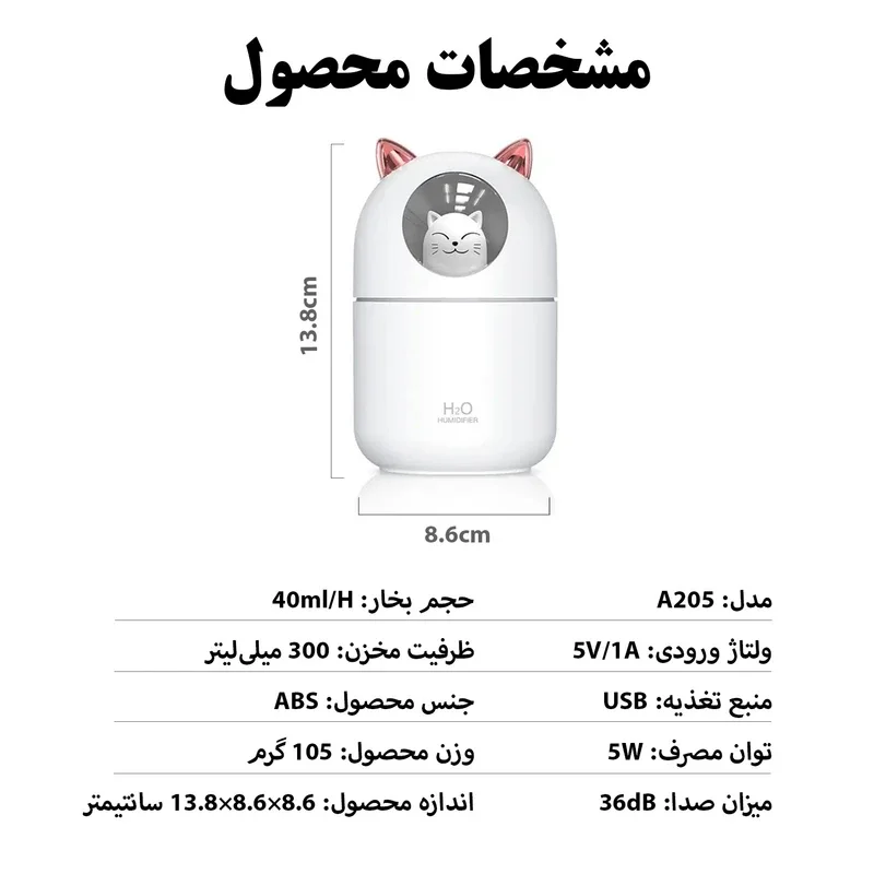 دستگاه بخور سرد طرح گربه چینی مدل A205 یک رطوبت ساز با طراحی فانتزی و جذاب است که علاوه بر عملکرد به عنوان رطوبت ساز، به عنوان چراغ خواب و دکوراسیون نیز مورد استفاده قرار میگیرد. این دستگاه به رطوبت رسانی پوست به ویژه در فصول سرد سال کمک میکند . همچنین شما میتوانید چند قطره اسانس خوش بو کننده به آب اضافه کنید تا بوی مطبوع در فضا پخش شود. این رطوبت ساز به تأمین رطوبت مورد نیاز گیاهان و تنفس راحتتر افراد کمک میکند. دستگاه بخور سرد طرح گربه فضایی مدل A205 با طراحی زیبا و کارآمد خود، یک انتخاب عالی برای هر فضایی است. همین حالا می توانید این دستگاه بخور را تهیه کنید و از مزایای فوق العاده آن بهرهمند شوید.